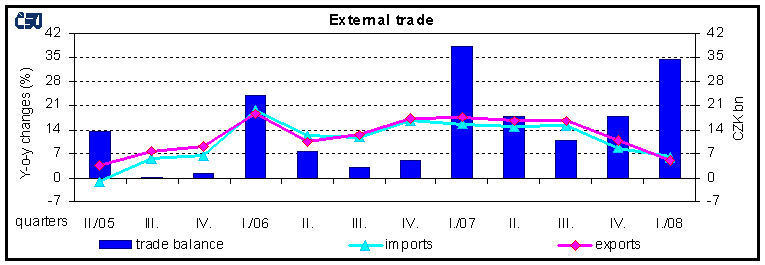 In Q1 2008 external trade 1 grew less year-on-year. External trade turnover grew by 5.6%. Both exports and imports recorded lower rates of growth; increase of exports was by 1.0 percentage point lower than increase of imports. The trade balance reached a CZK 34.6 billion surplus.