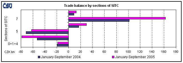 The most important item of exports of manufacturing industries were road vehicles which had a share of 16.1% in total exports in Q1-Q3 2005 as against 15.0% in the corresponding period of 2004, among them in particular passenger cars (a share of 7.8% as against 6.8%) and motor vehicle parts and accessories (a share of 7.2% as against 7.1%). Passenger cars had a share of a fifth in the growth of total exports and motor vehicle parts and accessories 8%. The surplus of external trade in passenger cars increased from CZK 46.8 billion in Q1-Q3 2004 to CZK 74.5 billion in Q1-Q3 2005 and surplus of trade in motor vehicle parts and accessories from CZK 42.0 billion to CZK 43.3 billion. From among products of mechanical engineering, a high increase was also recorded for exports of office machinery and automatic data processing machines, which led to an improvement of the surplus of trade in these products by CZK 16.7 billion. A positive influence on increasing exports was the growing output of ‘chemicals, chemical products and man-made fibres’ and ‘rubber and plastic products’, which at the same time made possible to reduce imports of these products. This in total affected lower deficit of trade in ‘medicinal and pharmaceutical products’, ‘plastics in primary forms’, ‘plastics in non-primary forms’ and ‘chemical materials and products, n.e.s.’ (in total by CZK 5.4 billion);