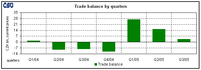 - a trade balance improvement of CZK 60.7 billion. In Q1-Q3 2005, external trade surplus stood at CZK 45.3 billion 2 (3.3% of total exports) as against the deficit of CZK 15.4 billion in the corresponding period of 2004. However, behind this figure are gradual decreases in the surplus in individual quarters. Whereas in Q1 2005 the active balance amounted to 6.1% of exports and in Q2 2005 still 3.2% of exports, in Q3 2005 it was only 0.7% of exports.