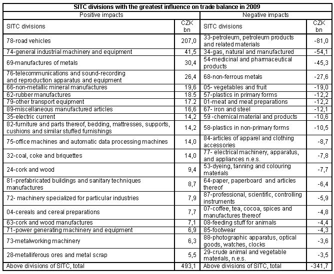 - Machinery and transport equipment a shrinking of exports by 15.4% (CZK 205.4 billion and imports by 19.0% (CZK 188.6 billion). The decrease of the value of exports and imports was the highest among all SITC sections and brought a marked affection of the overall shrinking of external trade. The positive balance of external trade with machinery and transport equipment reached CZK 319.4 billion against CZK 336.2 billion in 2008 (with EU states CZK 463.7 billion against CZK 472.3 billion). Surplus of trade balance was registered, except electrical equipment (whose balance ended with a deficit of CZK 7.8 billion against a surplus CZK 16.8 billion in 2008) for all other machinery groups. The highest active balance was evident for road vehicles, then for manufacture of machinery and equipment, telecommunications and sound-recording and reproduction apparatus and equipment, office machines and automatic data-processing machinery and other transport equipment;