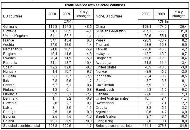 Trade balance and its y-o-y changes for particular groups of countries were due to the development of the trade balance with partner states. The total external trade surplus with EU states in 2009 was namely affected (CZK 389.5 billion compared to CZK 336.3 billion in 2008) by the positive balance with five states (Germany, Slovakia, the United Kingdom, France and Austria). Within the total deficit of the balance with non-EU countries, CZK 285.4 billion against CZK 357.3 billion in 2008) fell on three states (China, Russia and Japan).