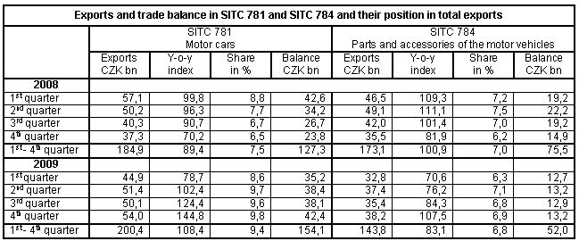 - decrease of industrial production, which affected almost all branches of the manufacturing industry. The two-digit drop of production in these branches had negative influence on total exports. In 2009, compared to 2008, exports of manufacturing industry 9 decreased by 15.0% (CZK 357.3 billion) and its share in total exports decreased to 95.1% from 96.1% in 2008. Exports of manufacturing industry products were dominated by machinery and transport equipment, namely road vehicles, electrical machinery, general industrial machinery and equipment and telecommunications equipment. The share of road vehicles in total exports was 17.3% in 2009 (15.8% in Q1-Q3 2008), of which passenger cars 9.4% and motor vehicles equipment 6.8%. The surplus of external trade with road vehicles (CZK 207.0 billion) in 2009 was the highest among all SITC sections and by CZK 18.8 billion higher in the y-o-y comparison (the increase was CZK 26.8 billion in motor cars and parts and accessories of the motor vehicles the surplus dropped by CZK 23.5 billion).