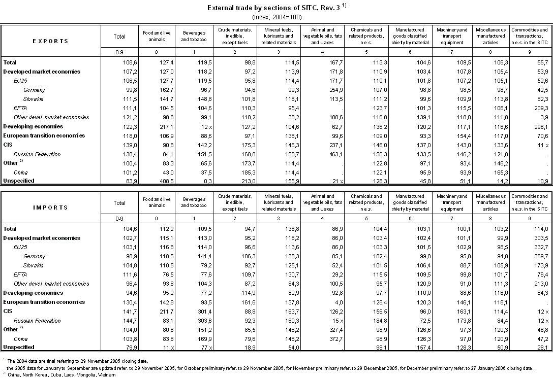 - a turnover increase of 6.6%, i.e. CZK 229.3 billion. External trade turnover reached CZK 3 701.0 billion, exports having a prevailing share (64.9%) in the year-on-year increase, the share of imports was 35.1%. Exports grew by 8.6%, i.e. CZK 148.8 billion year-on-year and imports by 4.6%, i.e. CZK 80.5 billion. Various developments in individual quarters of the year are behind the overall dynamics of exports and imports in 2005. Year-on-year, in the first quarter exports were up by 16.8% and imports up by 10.0%, in the second quarter exports up by 4.2% and imports down by 0.8%, in the third quarter exports up by 8.1% and imports up by 6.0%, and in the fourth quarter exports up by 6.8% and imports up by 4.4%. In all months of 2005 the dynamics of exports were faster than dynamics of imports. If converted to EUR and USD, external trade in 2005 grew more. Due to appreciation of CZK against these currencies, exports and imports in EUR rose by 16.3% and 12.0% respectively and exports and imports in USD increased by 16.3% and 11.9% respectively;
