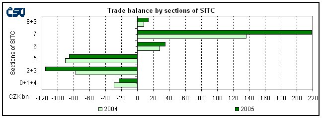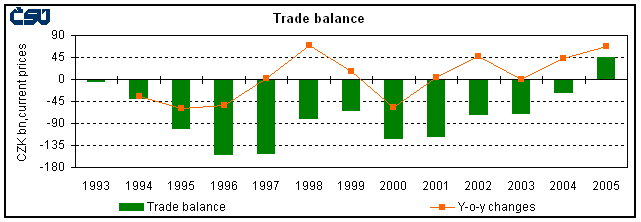 - a trade balance4 improvement of CZK 68.3 billion. In 2005 external trade reached a surplus of CZK 41.9 billion (2.2% of exports) as against deficit CZK 26.4 billion in 2004. However, behind the active balance were gradually decreasing surpluses in the first, second and third quarters of 2005 (CZK 27.6 billion, CZK 14.3 billion and CZK 0.3 billion respectively) and a slight deficit in the fourth quarter (CZK 0.3 billion). The trade balance improvement was focused territorially on the EU25 states (CZK 56.8 billion), in terms of the commodity structure on machinery and transport equipment (CZK 82.3 billion).