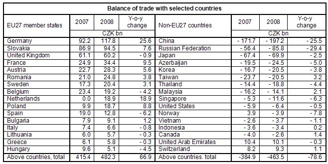 - trade balance surplus, which decreased by CZK 18.5 billion and reached CZK 69.4 billion (the rate of coverage of imports by exports was 102.9% in comparison to 103.7% in 2007), was a result of active trade balance (albeit decreasing) in Q1–Q3 and passive trade balance in Q4 (exports covering 97.2% of imports). By group of countries, trade surplus with EU27 countries rose by CZK 71.1 billion (down by CZK 6.6 billion y-o-y in Q4) and trade deficit with non-EU27 countries increased by CZK 89.6 billion (up by CZK 27.5 billion in Q4). Trade surplus with the European transition economies decreased by CZK 3.3 billion and with EFTA states by CZK 8.2 billion. Trade deficit deteriorated with the CIS 4 countries (by CZK 38.9 billion), other states 5 (by CZK 26.8 billion), other developed market economies (by CZK 5.3 billion) and developing economies (by CZK 9.1 billion). By commodity section, trade surplus rose in ‘machinery and transport equipment’ (by CZK 15.5 billion) and ‘manufactured goods classified chiefly by material’ (by CZK 8.9 billion). Trade deficit improved in ‘agricultural and food crude materials and products‘ (by CZK 9.0 billion) and ‘chemicals and chemical products’ (by CZK 4.3 billion). Trade deficit grew in ‘crude materials, inedible, and mineral fuels’ (by CZK 45.2 billion) and surplus decreased in ‘miscellaneous manufactured articles’ (by CZK 11.1 billion);