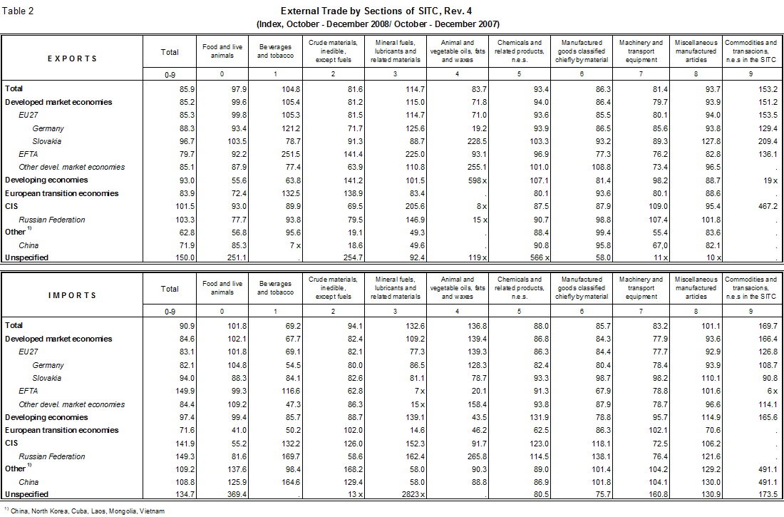 - by group of countries, the share of EU27 countries in total exports slightly dropped (from 85.3% to 85.1%), and in total imports decreased more (from 70.8% to 67.0%). A higher share in total exports was registered only for CIS countries (from 3.7% to 4.3%), while the shares of the remaining groups of countries either decreased (EFTA states, other developed market economies and European transition economies) or did not change (developing economies and other states). In total imports, the shares grew of CIS countries (from 6.6% to 8.8%), other states (from 7.9% to 9.0%), developing economies and ETˇFTA states; the low share of European transition economies (0.3%) remained at the 20O7 level and the share of other developed market economies slightly decreased;