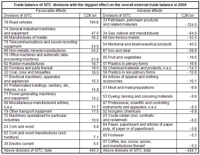 - manufactured goods classified chiefly by material by decreasing exports and imports. The share of these goods dropped in total exports and total imports (from 20.2% to 19.7% and from 20.9% to 19.8% respectively). The trade surplus grew by CZK 8.9 billion in 2008 and reached CZK 9.8 billion (of which CZK 18.4 billion with EU27 countries). This improvement was due to decreases in trade deficit in ‘non-ferrous metals’ (by CZK 11.2 billion) and ‘iron and steel’ (by CZK 1.4 billion). The highest trade surpluses were reached in ‘manufactures of metals’, ‘non-metallic mineral manufactures’ and ‘rubber manufactures, n.e.s.’;