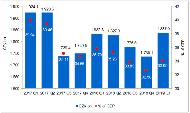 In Q1 2019, the general government sector balance decreased by CZK 3.6 bn, y-o-y. The central government balance decreased by CZK 9.6 bn, y-o-y, and reached the deficit CZK 26.1 bn. while local government performance ended up with the surplus of CZK 20.4 bn, which was higher by CZK 6.0 bn, y-o-y. Social security funds reached the surplus CZK 3.4 bn. that remained unchanged.
