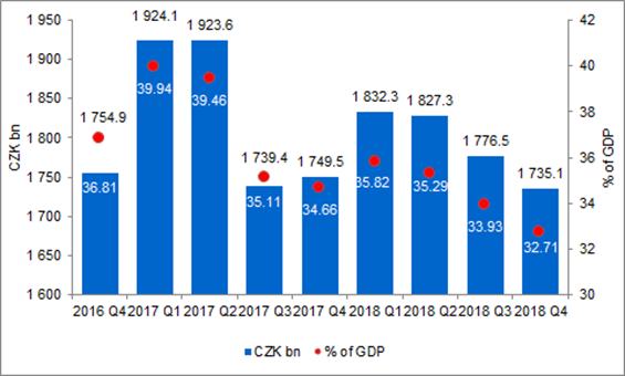 In Q4 2018, the general government sector balance decreased by CZK 12.0 bn, y-o-y, which was contributed to mainly by the central government. The central government balance decreased by CZK 10.9 bn, y-o-y, to CZK 1.5 bn, which was contributed to by an increase in both current and investment expenditure. Local government performance ended up with the deficit of CZK 12.9 bn, which was higher by CZK 5.9 bn, y-o-y. On the contrary, social security funds balance improved by CZK 4.7 bn, y-o-y, to CZK 1.6 bn.