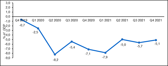 Seasonally adjusted general government sector balance, Q4 2019 – Q4 2021