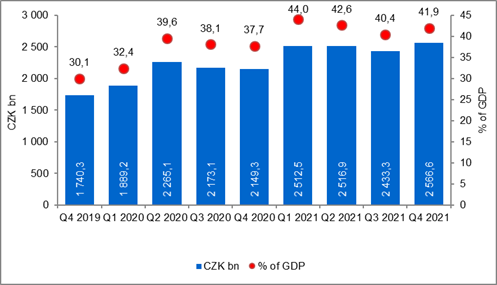 Regarding the debt structure, mainly the following increased, year-on-year: issued debt securities (CZK +346.1 bn) and the volume of received loans (CZK +66.0 bn). Issued debt securities continue to be the main debt component.