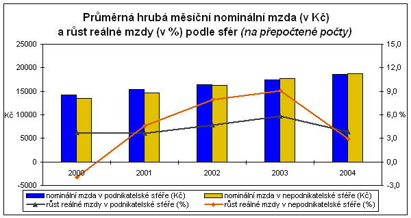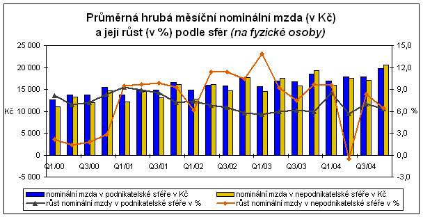 Zatímco na vyšším meziročním růstu mezd v 1., resp. 3. čtvrtletí 2004 (o 8,7 %, resp. 7,3 %) se podílely obě sféry (podnikatelská vzrostla o 8,5 %, resp. 7,0 %, nepodnikatelská o 9,6 %, resp. 8,3 %), nízký přírůstek ve 2. čtvrtletí (o 4,2 %) byl ovlivněn protichůdným vývojem, a to mzdovým růstem ve sféře podnikatelské (o 5,7 %) při současném poklesu ve sféře nepodnikatelské (o 0,5 %). Aktuální údaje za 4. čtvrtletí přinesly shodu v meziročním přírůstku, když podnikatelská sféra vzrostla o 6,3 % a nepodnikatelská o 6,4 %. V posledních letech se jedná o shodu zcela ojedinělou s výjimkou 1. čtvrtletí roku 2001, kdy se však úroveň přírůstku pohybovala zhruba o 3 procentní body výše. Z dlouhodobějšího pohledu na čtvrté čtvrtletí (v letech 2000 až 2004) se relativní meziroční přírůstek nominální mzdy v podnikatelské sféře pohybuje zhruba v rozpětí od 5,8 % (v roce 2002) do 8,3 % (v roce 2000). Nepodnikatelská sféra v uvedeném období zažila nejvyšší nárůst mzdové hladiny v roce 2002, a to o 10,4 % a nejnižší nárůst v roce 2000, o 2,8 %. Meziroční přírůstek ve 4. čtvrtletí 2004 se u podnikatelské sféry pohybuje spíše při dolní hranici příslušného intervalu, u nepodnikatelské sféry zhruba v jeho středu.