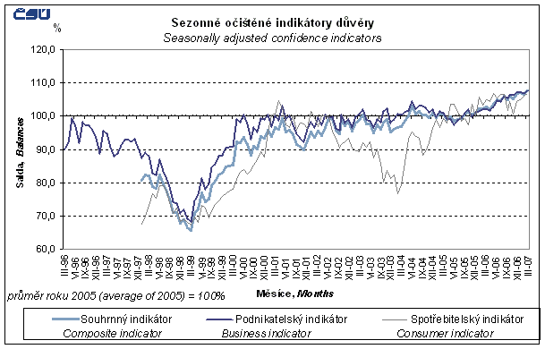 Saldo souhrnného indikátoru důvěry (indikátoru ekonomického sentimentu) se v březnu 2007 oproti předchozímu měsíci zvýšilo o 1 bod. Saldo podnikatelského indikátoru se zvýšilo o 1,1 bodu. Saldo indikátoru důvěry spotřebitelů se zvýšilo o 0,9 bodu. Všechny tři indikátory dosáhly v březnu 2007 nejvyšší hodnoty v jejich historii. Ve srovnání s březnem 2006 je saldo souhrnného indikátoru důvěry o 5,5 bodů vyšší, důvěra podnikatelů je o 6,4 bodu vyšší a důvěra spotřebitelů je vyšší o 1,8 bodu.