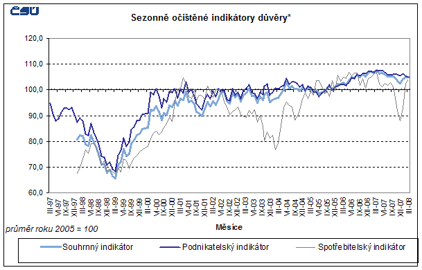 Saldo souhrnného indikátoru důvěry (indikátoru ekonomického sentimentu) se v březnu 2008 meziměsíčně nepatrně snížilo (o 0,1 bodu). Saldo podnikatelského indikátoru se snížilo o 0,6 bodu, saldo spotřebitelského indikátoru se zvýšilo o 1,7 bodu. Ve srovnání s březnem 2007 je saldo souhrnného indikátoru důvěry o 3,1 bodu nižší, důvěra podnikatelů je nižší o 3,3 bodu a důvěra spotřebitelů o 2,6 bodu.
