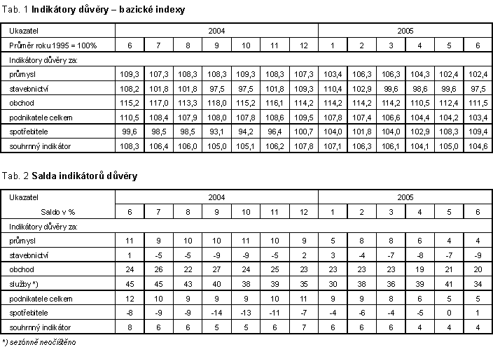 Saldo souhrnného indikátoru důvěry se v červnu 2005 oproti předchozímu měsíci nezměnilo, stejně jako saldo podnikatelského indikátoru důvěry. Saldo indikátoru důvěry spotřebitelů se zvýšilo o 1 bod. Ve srovnání s červnem 2004 bylo saldo souhrnného indikátoru důvěry o 4 body nižší, saldo indikátoru důvěry podnikatelů o 7 bodů nižší a u spotřebitelů bylo saldo o 9 bodů vyšší.