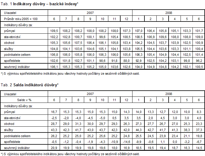 Saldo souhrnného indikátoru důvěry (indikátoru ekonomického sentimentu) se v červnu 2008 meziměsíčně snížilo o 1,8 bodu (v květnu o 2,4 bodu). Saldo podnikatelského indikátoru se snížilo o 1,3 bodu a saldo spotřebitelského indikátoru o 3,5 bodu. Ve srovnání s červnem 2007 je saldo souhrnného indikátoru důvěry o 6,4 bodu nižší, důvěra podnikatelů je nižší rovněž o 6,4 bodu a důvěra spotřebitelů je nižší o 6,2 bodu.