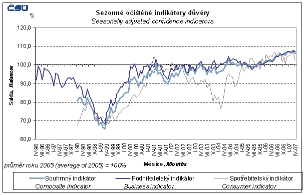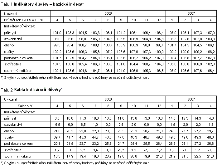 Saldo souhrnného indikátoru důvěry (indikátoru ekonomického sentimentu) se v dubnu 2007 oproti předchozímu měsíci, kdy dosáhlo svého historického maxima, snížilo o 1,2 bodu. Saldo podnikatelského indikátoru se snížilo o 0,4 bodu na třetí nejvyšší hodnotu ve své historii. Saldo indikátoru důvěry spotřebitelů se snížilo o 4,5 bodu. Ve srovnání s dubnem 2006 je saldo souhrnného indikátoru důvěry o 5 bodů vyšší, důvěra podnikatelů je o 6,7 bodu vyšší a důvěra spotřebitelů je o 2 body nižší.