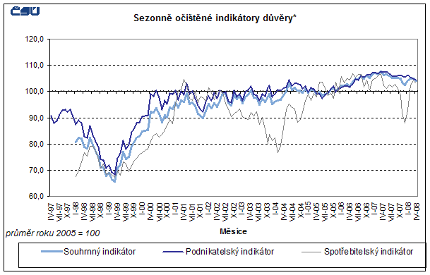 Saldo souhrnného indikátoru důvěry (indikátoru ekonomického sentimentu) se v dubnu 2008 meziměsíčně snížilo o 0,7 bodu. Saldo podnikatelského indikátoru se snížilo o 0,5 bodu a saldo spotřebitelského indikátoru o 1,1 bodu. Ve srovnání s dubnem 2007 je saldo souhrnného indikátoru důvěry o 2,6 bodu nižší, důvěra podnikatelů je nižší o 3,4 bodu a důvěra spotřebitelů je vyšší o 0,8 bodu.