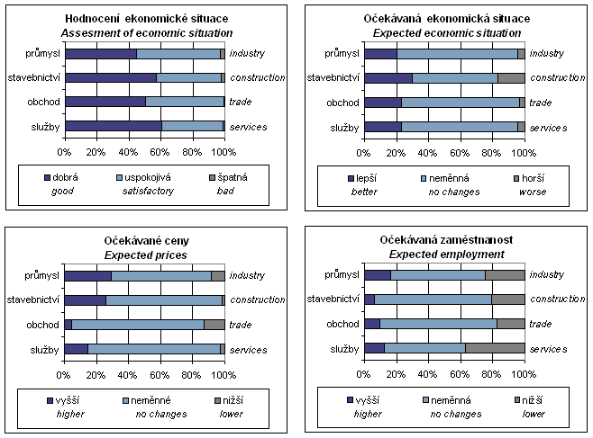 Uvedené údaje byly zpracovány váženě: v průmyslu a obchodě a ve službách jsou vahami tržby, ve stavebnictví stavební práce provedené podle dodavatelských smluv. Sledované soubory firem představují v průmyslu a ve stavebnictví více než polovinu tržeb, resp. objemu stavebních prací, v obchodě čtvrtinu tržeb.