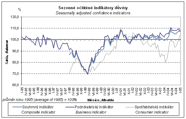 Saldo souhrnného indikátoru důvěry v lednu 2005 se oproti předchozímu měsíci snížilo, což bylo způsobeno poklesem salda podnikatelského indikátoru důvěry. Indikátor důvěry spotřebitelů vzrostl. V meziročním srovnání byl však indikátor důvěry u podnikatelů vyšší o 6 bodů, u spotřebitelů o 16 bodů a souhrnný indikátor důvěry byl vyšší o 7 bodů.
