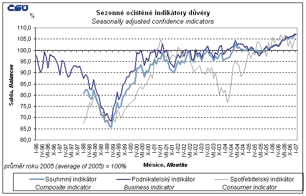 Saldo souhrnného indikátoru důvěry (indikátoru ekonomického sentimentu) se v lednu 2007 oproti předchozímu měsíci zvýšilo o 0,6 bodu a dosáhlo nejvyšší hodnoty ve své historii. Saldo podnikatelského indikátoru se zvýšilo o 0,5 a také dosáhlo nejvyšší hodnoty ve své historii. Saldo indikátoru důvěry spotřebitelů se zvýšilo o 0,7 bodu. Ve srovnání s lednem 2006 je saldo souhrnného indikátoru důvěry o 5,5 bodu vyšší, důvěra podnikatelů je o 7 bodů vyšší a spotřebitelů o 0,6 bodu nižší.