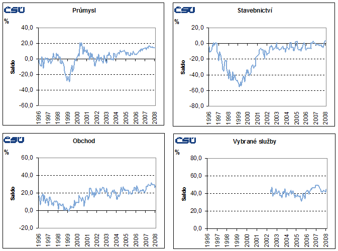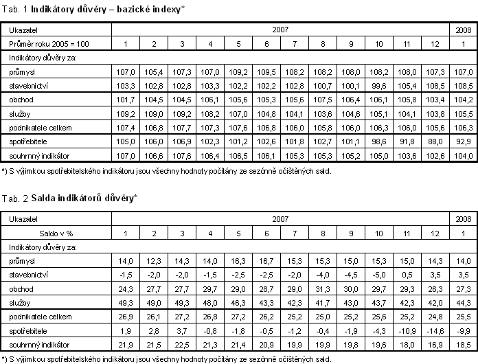 Saldo souhrnného indikátoru důvěry (indikátoru ekonomického sentimentu) se v lednu 2008 meziměsíčně zvýšilo o 1,6 bodu, a to vlivem růstu podnikatelského i spotřebitelského indikátoru důvěry. Saldo podnikatelského indikátoru se zvýšilo 0,7 bodu. Saldo indikátoru důvěry spotřebitelů se zvýšilo o 4,7 bodu. Ve srovnání s lednem 2007 je saldo souhrnného indikátoru důvěry o 3,4 bodu nižší, důvěra podnikatelů je nižší o 1,4 bodu a důvěra spotřebitelů o 11,8 bodu.