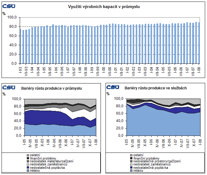 *) S výjimkou spotřebitelského indikátoru jsou všechny hodnoty počítány ze sezónně očištěných sald.V průmyslu se v lednu mírně zvýšilo hodnocení celkové ekonomické situace. Hodnocení celkové poptávky bylo v lednu méně příznivé, hodnocení zahraniční poptávky se zvýšilo. Zásoby se podle mínění respondentů mírně snížily. Pro příští tři měsíce očekávají respondenti pokračování příznivého vývoje výrobní činnosti i zaměstnanosti. Očekávání celkové ekonomické situace jsou pro příští tři i šest měsíců vyšší než v prosinci. Využití výrobních kapacit v průmyslu se oproti rekordní hodnotě z minulého čtvrtletí mírně snížilo a dosáhlo 88,8 %. Celkově se saldo indikátoru důvěry v průmyslu meziměsíčně nepatrně snížilo (o 0,3 bodu) a dosahuje stejné hodnoty jako v lednu 2007.