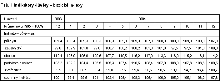 Saldo souhrnného indikátoru důvěry v prosinci 2004 oproti předchozímu měsíci vzrostlo, což bylo způsobeno jak růstem salda podnikatelského indikátoru důvěry, zejména ve stavebnictví, tak salda indikátoru důvěry spotřebitelů. V meziročním srovnání byl podnikatelský indikátor důvěry o 6 bodů vyšší, spotřebitelský indikátor důvěry o 14 bodů a souhrnný indikátor důvěry o 7 bodů vyšší než v prosinci 2003.