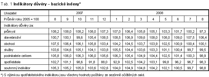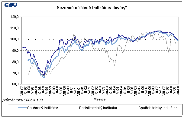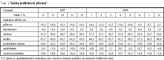 Saldo souhrnného indikátoru důvěry (indikátoru ekonomického sentimentu) se v srpnu 2008 meziměsíčně snížilo o 1 bod (v červenci o 0,9 bodu). Saldo podnikatelského indikátoru se snížilo o 1,7 bodu a saldo spotřebitelského indikátoru se zvýšilo o 1,6 bodu. Ve srovnání se srpnem 2007 je saldo souhrnného indikátoru důvěry o 7,3 bodu nižší, důvěra podnikatelů je nižší o 8,2 bodu a důvěra spotřebitelů je nižší o 4,2 bodu.