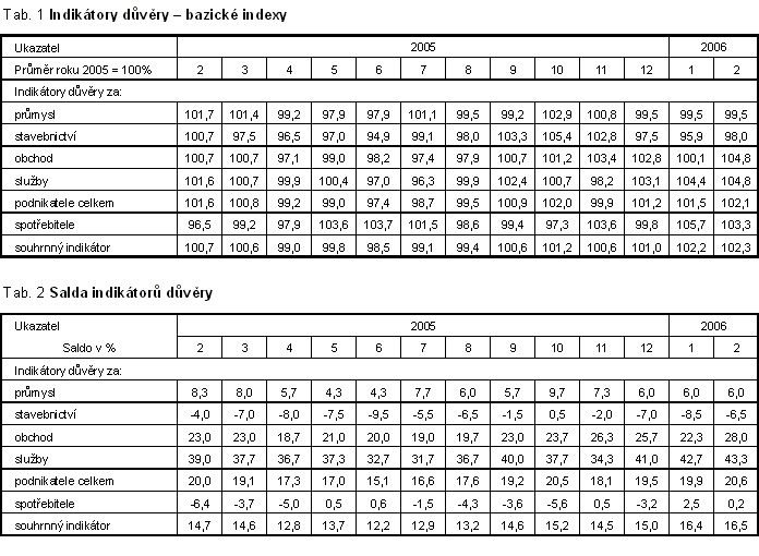 Saldo souhrnného indikátoru důvěry (indikátoru ekonomického sentimentu) v únoru 2006 oproti předchozímu měsíci nepatrně vzrostlo (o 0,1 bodu). Saldo podnikatelského indikátoru se zvýšilo o 0,7 bodu. Saldo indikátoru důvěry spotřebitelů se snížilo o 2,3 bodu. Ve srovnání s únorem 2005 je saldo souhrnného indikátoru důvěry o 1,8 bodu vyšší, u podnikatelů o 0,6 a u spotřebitelů je o 6,6 bodu vyšší.