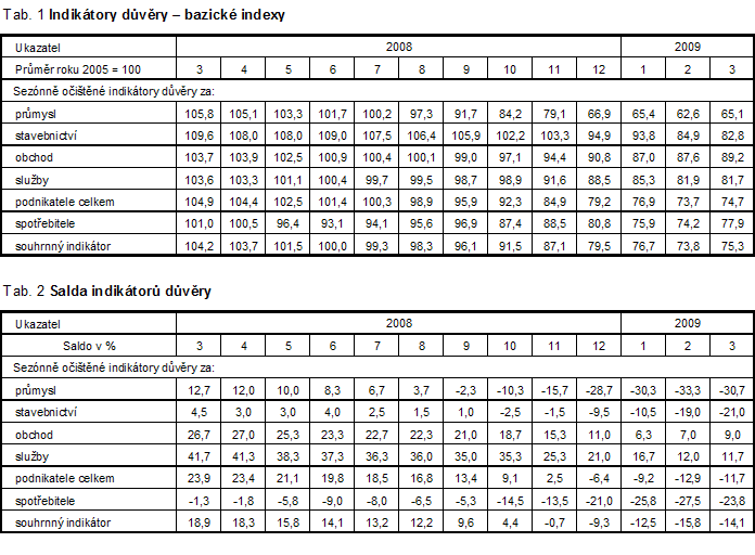 Saldo souhrnného indikátoru důvěry (indikátoru ekonomického sentimentu) se v březnu 2009 meziměsíčně poprvé od února 2008 zvýšilo, a to o 1,7 bodu. Saldo podnikatelského indikátoru se zvýšilo o 1,2 bodu a saldo spotřebitelského indikátoru se zvýšilo o 3,7 bodu. Ve srovnání s březnem 2008 je však saldo souhrnného indikátoru důvěry o 33 bodů nižší, důvěra podnikatelů je nižší o 35,6 bodu a důvěra spotřebitelů je nižší o 22,5 bodu.