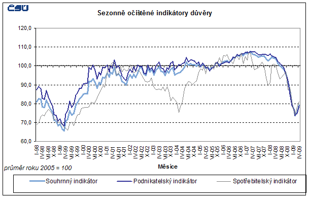 Saldo souhrnného indikátoru důvěry (indikátoru ekonomického sentimentu) se v dubnu 2009 meziměsíčně podruhé od února 2008 zvýšilo, a to o 4,2 bodu, (v březnu o 1,7 bodu). Saldo podnikatelského indikátoru se zvýšilo o 4,5 bodu a saldo spotřebitelského indikátoru vzrostlo o 3,3 bodu. Ve srovnání s dubnem 2008 je však saldo souhrnného indikátoru důvěry o 28,2 bodů nižší, důvěra podnikatelů je nižší o 30,6 bodu a důvěra spotřebitelů je nižší o 18,7 bodu.