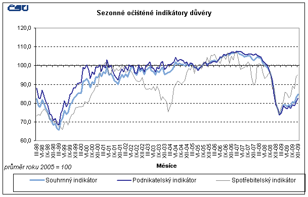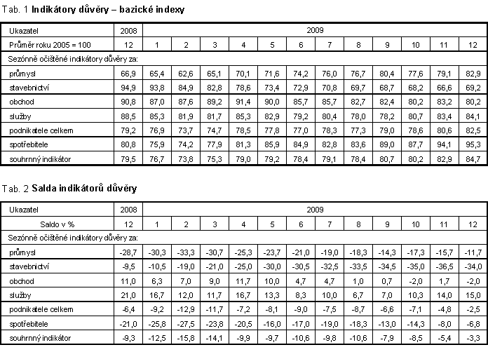 Důvěra v domácí ekonomiku se v prosinci opět zvýšila. Souhrnný indikátor důvěry (indikátor ekonomického sentimentu) se meziměsíčně zlepšil o 2,1 bodu, a to vlivem zvýšení důvěry spotřebitelů i podnikatelů. Mezi podnikateli důvěra meziměsíčně vzrostla v průmyslu, stavebnictví i ve vybraných službách. Ve srovnání s nízkou hodnotou v prosinci 2008 je souhrnný indikátor důvěry o 6 bodů vyšší.
