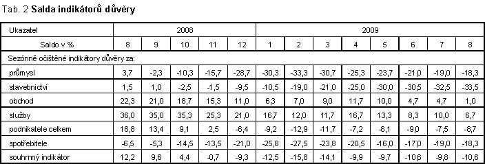 Indikátor důvěry podnikatelů se v srpnu oproti červenci snížil o 1,2 bodu. Mezi podnikateli se důvěra zvýšila jen v průmyslu. Důvěra ve stavebnictví mírně poklesla a nejvíce se snížila v obchodě a ve vybraných odvětvích služeb. Ve srovnání se srpnem 2008 je důvěra podnikatelů nižší o 25,5 bodu.