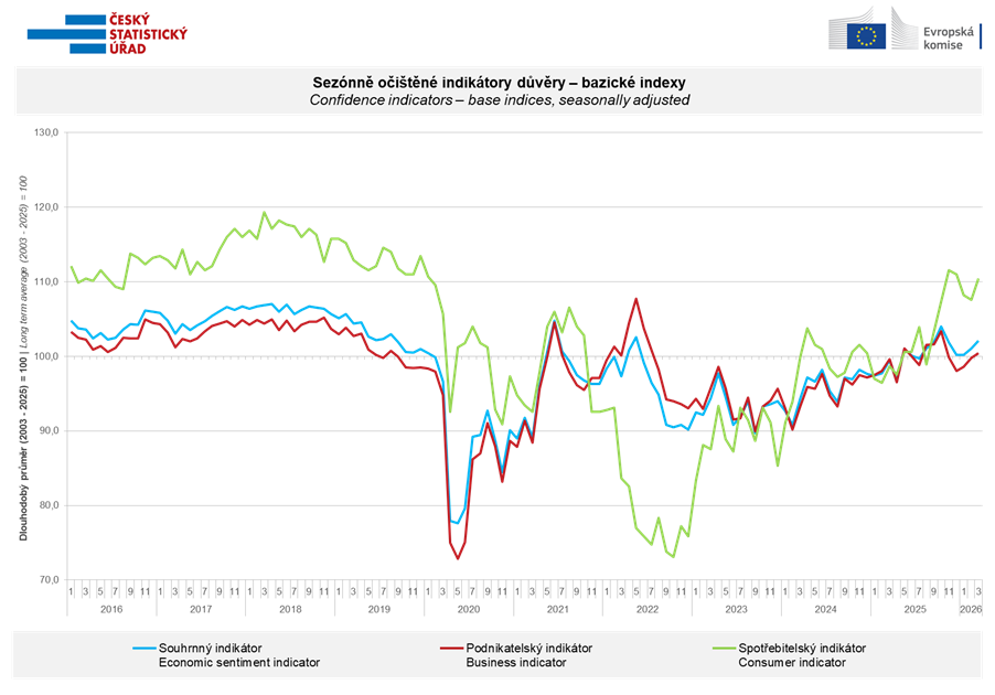 Důvěra spotřebitelů se meziměsíčně zvýšila. Indikátor důvěry vzrostl o 2,8 bodu na hodnotu 110,4. Podíl spotřebitelů očekávajících pro období příštích dvanácti měsíců zhoršení celkové ekonomické situace v Česku se druhý měsíc v řadě snížil. Podíl respondentů, kteří hodnotí svou současnou finanční situaci hůře, než tomu bylo v předchozích dvanácti měsících, se rovněž mírně snížil. Meziměsíčně se téměř nezměnil podíl domácností očekávajících zlepšení své finanční situace v příštích dvanácti měsících. Oproti únoru se poměrně výrazně zvýšily obavy domácností z růstu cen. Počet respondentů, kteří neplánují v příštích dvanácti měsících pořizovat velké nákupy, se oproti únoru mírně snížil.