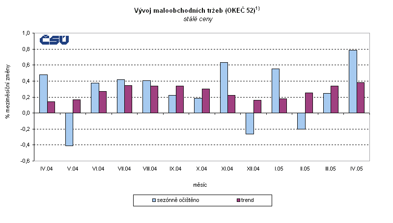 Sezónně očištěné tržby v maloobchodě (OKEČ 52) v dubnu meziměsíčně reálně vzrostly o 0,8 %, trendová složka o 0,4 %. V průběhu letošního roku se meziměsíční růst trendové složky trvale mírně zvyšuje (tabulka č. 1).