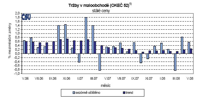 Sezónně očištěné tržby v maloobchodě (OKEČ 52) zaznamenaly v květnu meziměsíčně reálně poměrně vysoký růst o 0,6 %, a to shodně za potraviny i nepotravinářské zboží. Meziměsíční růst trendové složky o 0,2 % byl nejvyšší za posledních 10 měsíců (tabulka č. 3). Z dlouhodobého pohledu vykazovala trendová složka od poloviny roku 1998 nepřerušovaný růst. Ten se v polovině roku 2005 prudce zrychlil, naopak od dubna 2007 došlo k jeho poměrně výraznému zpomalení, které trvá dosud.