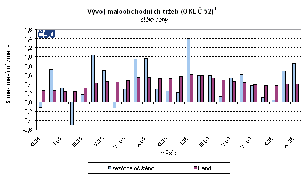 Sezónně očištěné tržby v maloobchodě (OKEČ 52) se v listopadu meziměsíčně reálně zvýšily o 0,9 %, v tom za potraviny o 1,5 %, za nepotravinářské zboží o 0,4 %. Trendová složka vzrostla stejně jako v předchozích pěti měsících o 0,4 % (tabulka č. 1).