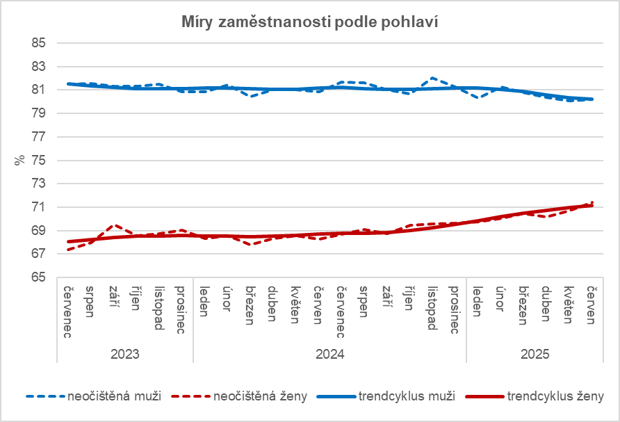 Podíl zaměstnaných k celé populaci 15–64letých dosáhl v červnu 75,8 %. Oproti červnu 2024 se zvýšil o 0,7 procentního bodu. Míra zaměstnanosti mužů činila 80,2 %, u žen 71,2 %.