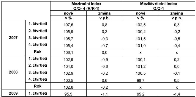 S ohledem na změny v datových zdrojích let 2007 a 2008 a s cílem poskytnout maximálně aktuální informace o trendech vývoje ekonomiky v podmínkách ekonomické krize provedl Český statistický úřad mimořádnou revizi časových řad čtvrtletních národních účtů, kterou nyní zveřejňuje. Upozorňuje však, že ukazatele za rok 2008 budou dále zpřesněny v návaznosti na nyní dokončovanou úplnou soustavu ročních národních účtů a budou publikovány spolu se čtvrtletními účty za 3. čtvrtletí dne 9. prosince. Rozsah stávajících úprav HDP ve čtvrtletní periodicitě ilustruje následující tabulka.