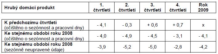 Hrubý domácí produkt, očištěný o cenové, sezónní a kalendářní vlivy, klesl v posledním loňském čtvrtletí meziročně o 3,1 %, celková zaměstnanost se snížila o 1,9 %. Za celý rok 2009 byl HDP proti předchozímu roku nižší reálně o 4,1 %, zatímco zaměstnanost klesla v průměru o 1,2 %.