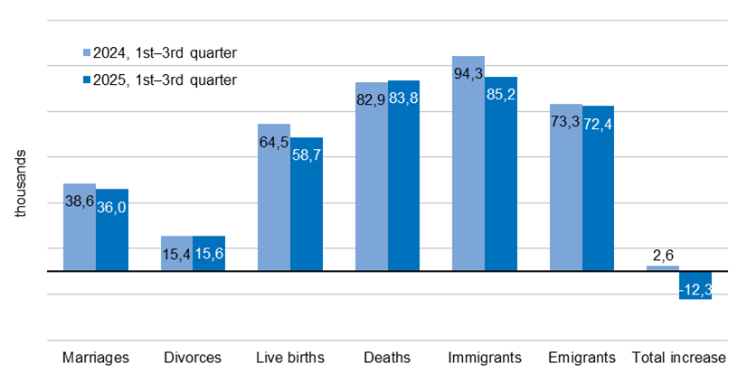As of 30 September 2025, the population of Czechia had 10,897,000 inhabitants, 12.3 thousand fewer than at the beginning of the year. The decline in the population was caused by a negative natural change, as the number of live births was 25.1 thousand lower than the number of deaths. It was the deepest natural decrease ever recorded for the first three quarters of the year in the history of the independent Czech Republic. The net international migration was positive, reaching 12.8 thousand persons, but was 8.3 thousand lower year-on-year. “In the first three quarters of this year, 85.2 thousand immigrants from abroad were registered, 10% fewer year-on-year. However, the monthly number of immigrants in September – 16.7 thousand – was the highest since September 2022. The data shows that behind the increase is the easing of exit restrictions in Ukraine for men aged 18–22,” said Michaela Němečková from the Demographic Statistics Unit of the Czech Statistical Office. A total of 72.4 thousand persons emigrated from Czechia to other countries during the first three quarters, 0.9 thousand fewer year-on-year. However, the number of emigrants in 2024 was record high. A large share of these departures consisted of persons whose temporary protection status had expired.