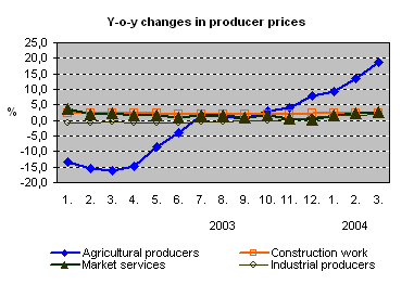 Compared year-on-year, prices of industrial producers increased by 1.7% over the first quarter of 2004 of which March saw the highest rise (+2.1%). Prices of food products, beverages and tobacco rose by 4.7% on average. Prices of bread and mill and starch products increased in particular (+14.4% and 8.2%, respectively) as a result of a large rise in the price of bread wheat after the new harvest: the wheat sold at CZK 4 330 per tonne in February 2004 as against to CZK 3 166 per tonne in February 2003. Prices of industrial feedingstuffs also grew considerably in the first quarter (+11.3%), in response to price rises in fodder wheat (+43.4% in February year-on-year), fodder maize and fodder oats. Prices of meat and meat products were higher by 3.0% and prices of dairy products by 4.9% on first quarter 2004 average.