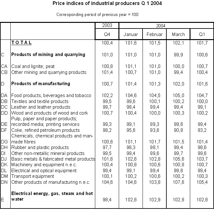 In the area of energy, prices of electricity (incl. distribution) and heat were up by 3.2% and 1.3%, respectively. Coke and refinery products prices were still 6.8% below their first quarter 2003 level (they reacted to year-on-year decreases in import prices of mineral fuels and mineral oils).