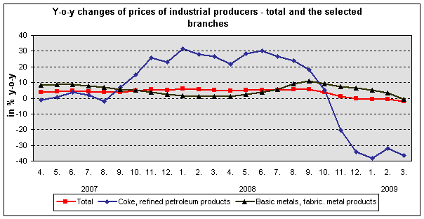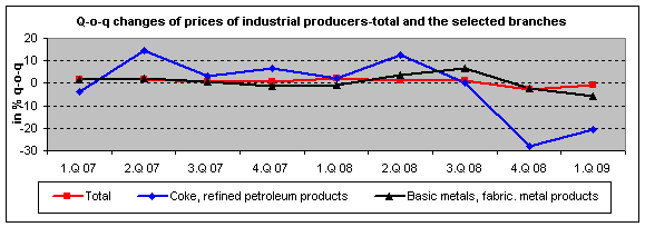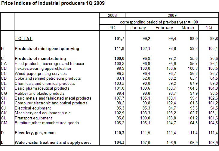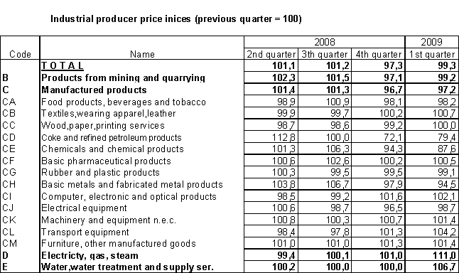 In comparison to Q4 2008, industrial producer prices fell by 0.7% in Q1 2009. The most rapid price decreases were observed for coke and refined petroleum products (-20.6%), chemicals and chemical products (-12.4%) and basic metals and fabricated metal products (-5.5%). Mainly the prices of electricity, gas, steam and air conditioning (+11.0%) and water (+6.7%) grew.
