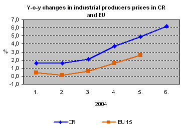 Compared with EU25, industrial producer prices in the Czech Republic grew faster in 2004. While they rose by 2.6% y-o-y in May in EU25, the Czech Republic reported +4.9%. Increases in some countries were even higher: 10.0% in Hungary, 6.9% in Latvia, and 5.6% in Cyprus, all in May 2004, y-o-y.