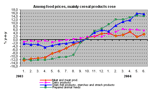 Among individual groups of food, the highest increases were reported for prices of grain mill products, starches and starch products (+14.4%), prepared animal feeds (+14.1%) and other food products (+7.3%, of which prices of bread, fresh pastry and cakes +14.1%). The development of these prices was closely connected with the price of food wheat, which reached 4 612 CZK/tonne in April 2004, while it sold at 3 190 CZK/tonne in June 2003. It responded to a low harvest of 2003 and to higher prices on the world markets. Prices of wheat sold on the world markets (Chicago) grew to 375.53 USc/bushel in May 2004 from 317.33 USc/bushel a year earlier.