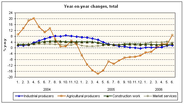 Prices of agricultural producers were up by 4.7% year-on-year in Q2 2006 (in comparison to a decrease of 1.5% in Q1 2006). The growth was affected by prices of crop products, which rose by 21.6%. The prices of animal products were lower by 2.6%.