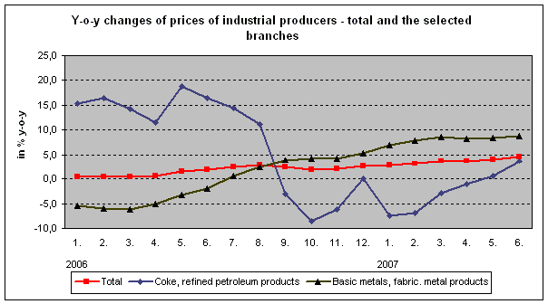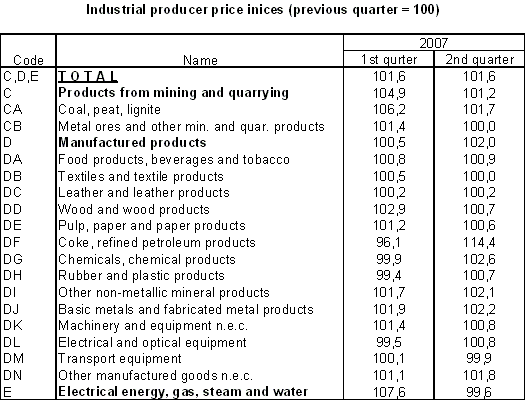 In Q2 2007 compared to Q1 2007 the prices of industrial producers increased by 1.6 %. The growth of the price level was significantly affected by particularly the growth of prices for ‘ coke, refined petroleum products’. Prices in this branch increased by 14.4% quarter-on-quarter. While Q1 was influenced by a price drop in January, Q2 was characterised by the growth of prices (prices of refined petroleum products). Another significant factor, influencing the growth of the overall price index, was the increase of prices of ‘ basic metals and fabricated metal products’ by 2.2%. Prices in this branch have been growing already for 17 months and affected the price level in both Q2 and Q1 2007. The development of the price index was also affected by the price growth in the food sector by 0.9%. In Q2 as against Q1 prices of meat and meat products, dairy products and ice cream and pastry goods recorded a growing tendency.