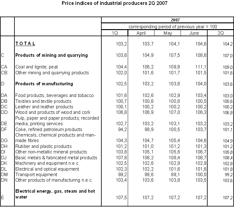 Year-on-year industrial producers prices increased by 4.2% in Q2 2007 compared to Q2 2006 (by 3.2% in Q1). The price level was significantly influenced by the growth of prices for ‘ basic metals and fabricated metal products’ by 8.4% of which the most for cast iron and steel tubes (+18.7%) and basic iron, steel and ferroy-alloys (+12.8%). Another factor that significantly affected the overall price index was the growth of prices for ‘electrical energy, gas, steam and hot water’. Prices increased by 7.2%, of which the most for electricity production and distribution (+9.1%). Among the branches that also affected the growth of the overall index for the whole industry with its price growth belonged other non-metallic mineral products (+5.8%). The biggest growth occurred in bricks and tiles (19.2%) and glass and glass products (10.3%). Prices of bricks and tiles have been increasing year-on-year since December 2005; the y-o-y growth in Q2 2007 of 19.2% is the highest since Q2 1998. Another increasing factor were prices of ‘food products, beverages and tobacco‘ (+3.0%). The biggest price growth occurred for ‘grain mill products, starches and starch products’ (+14.6%) and ‘fresh pastry goods and cakes’ (13.1%) which is an opposite trend in both groups compared to Q2 2006 (-0.9%, -6.6% respectively).